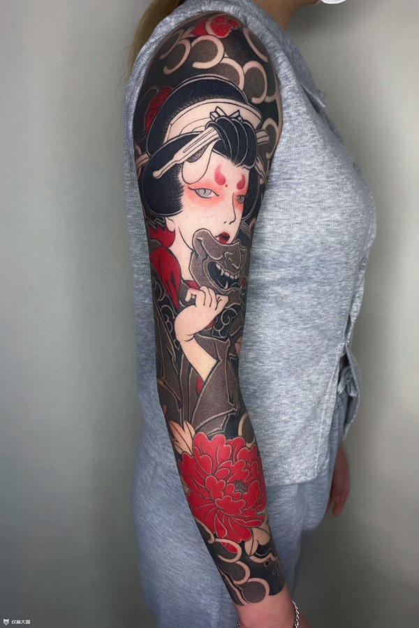 老传统艺妓花臂唯有牡丹真国色,开花时节动艺妓〔艺妓〕——完成度:95%#艺妓纹身刺青#花臂牡丹艺妓纹身