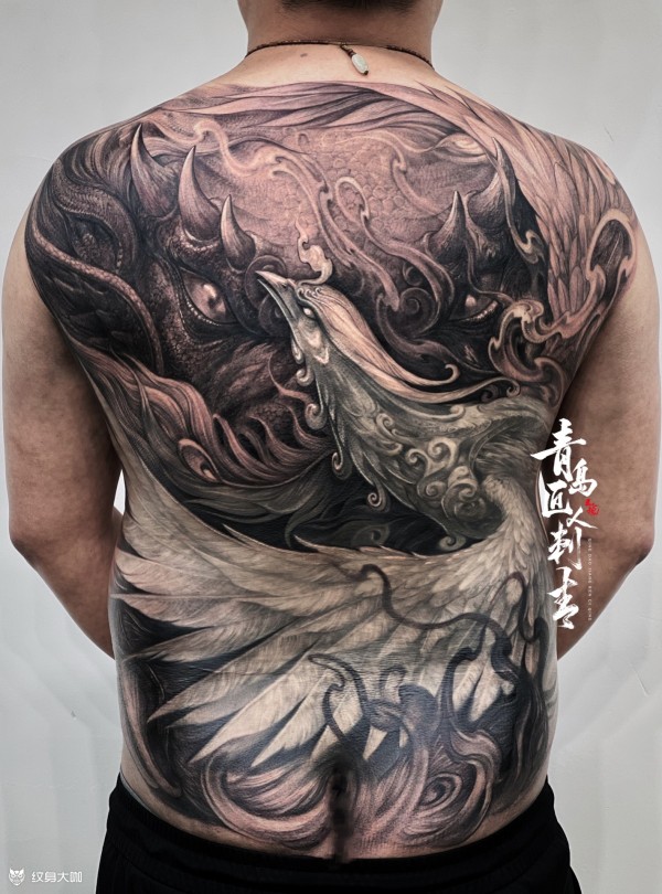 女生背部黑灰素描点刺技巧霸气大面积满背翅膀纹身图片