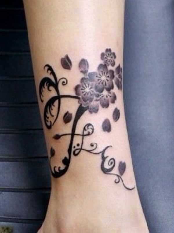 腿部樱花藤蔓纹身图案纹身图片