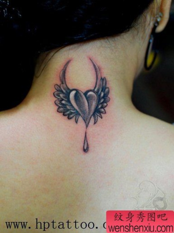 MM后颈部爱心翅膀纹身作品图片