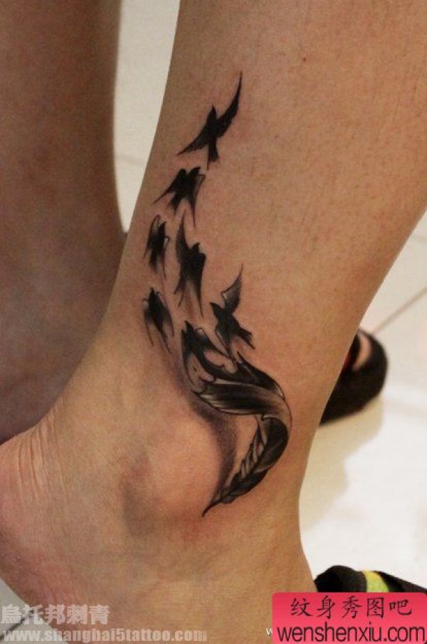 腿部羽毛小鸟纹身图案纹身图片
