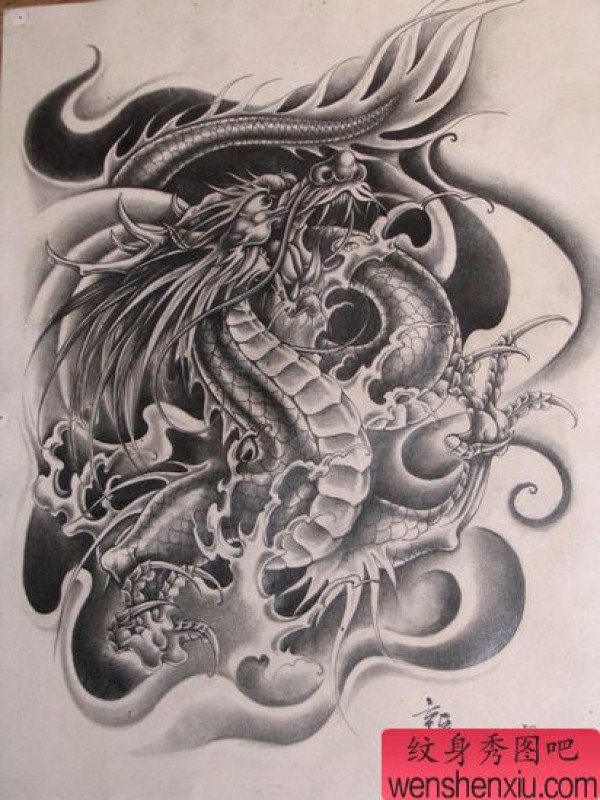 龙纹身手稿_一组老传统黑灰龙手稿纹身图案