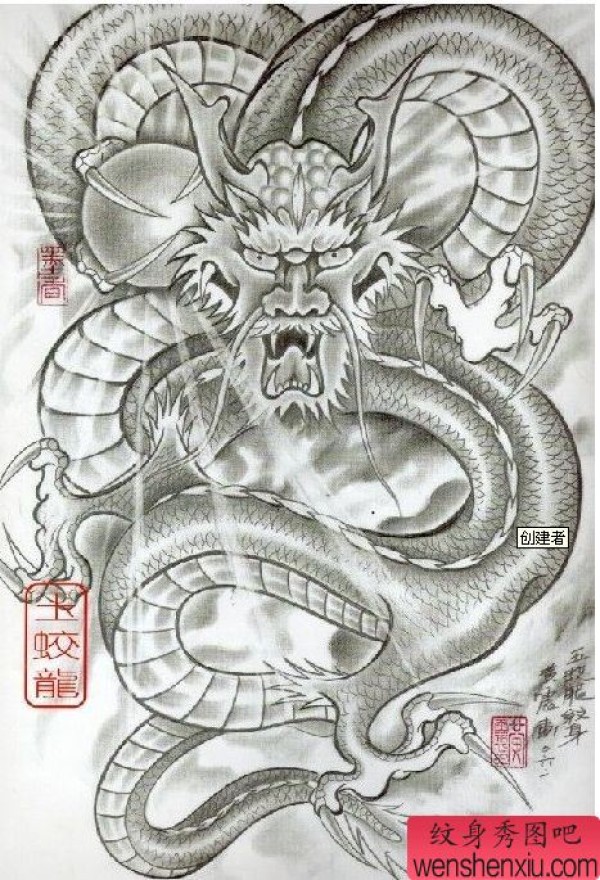 龙纹身手稿_一组老传统黑灰龙手稿纹身图案