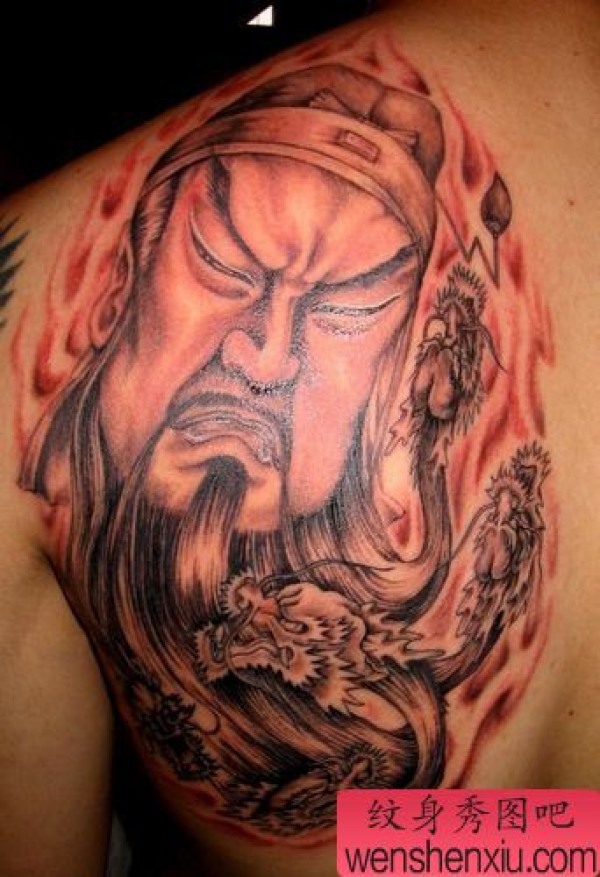 肩部关公头像龙头纹身图案