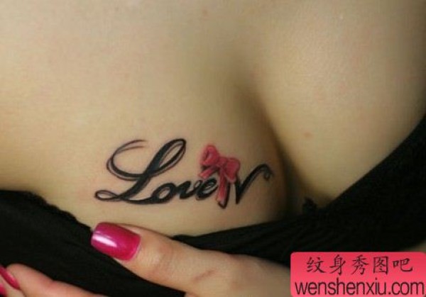 胸部文字彩色蝴蝶结纹身图案