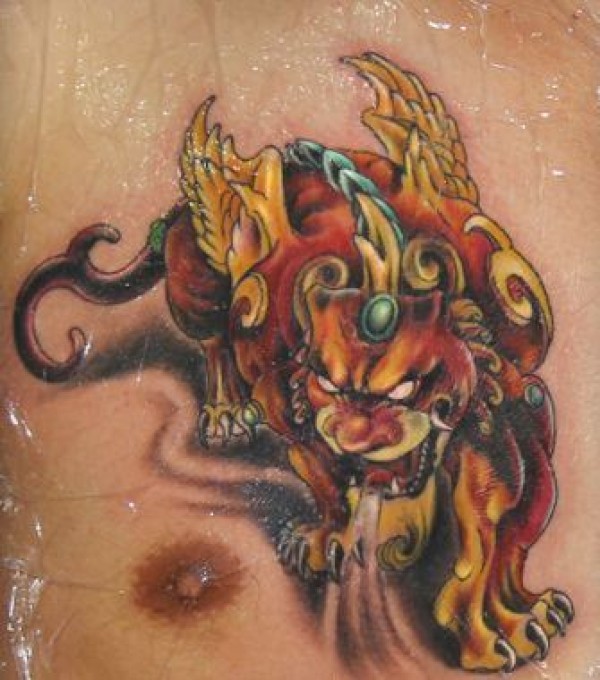 胸部彩色招财神兽貔貅纹身图案