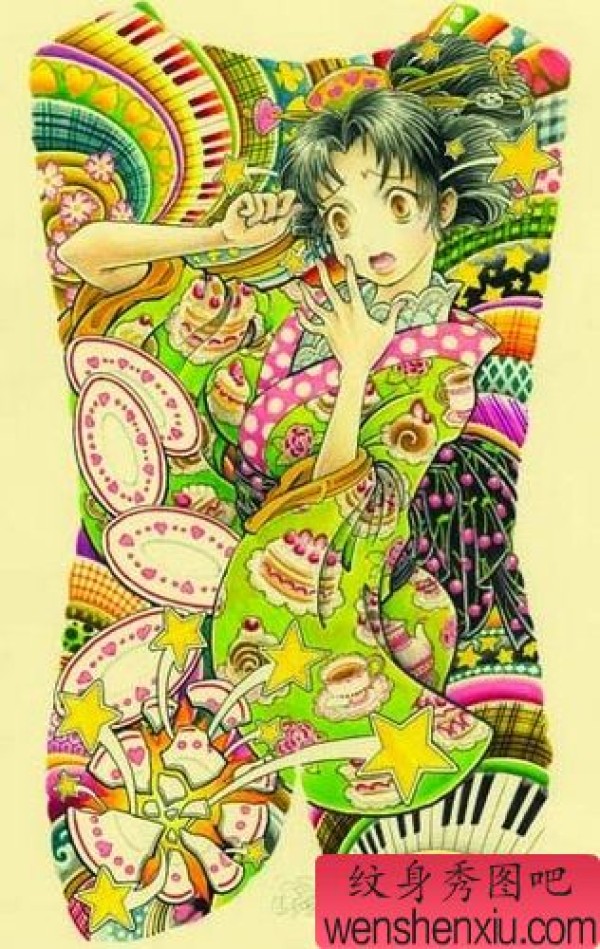 满背彩色卡通女孩美女纹身图案
