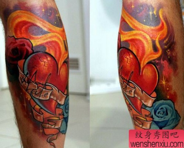 腿部彩色爱心火焰玫瑰纹身图案