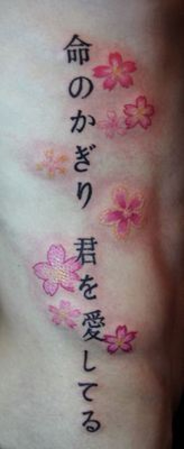 腰部图腾文字樱花纹身图案