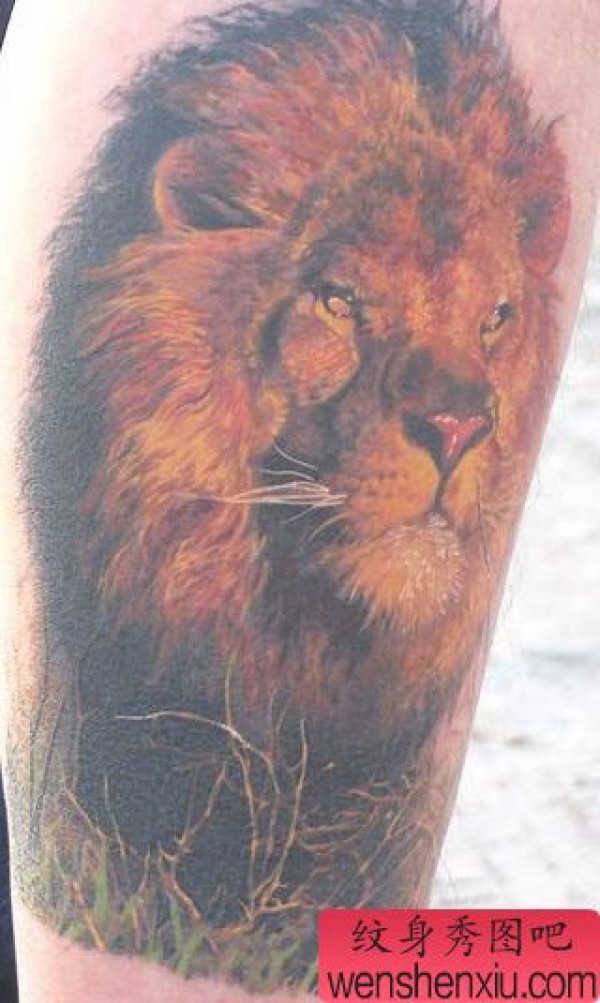 腿部彩色狮子头像纹身图案