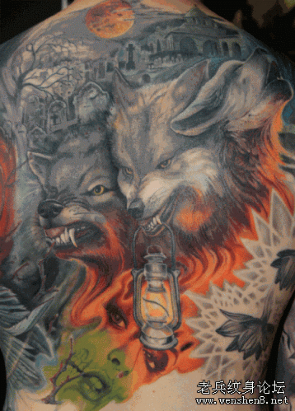 欧美满背彩色狼狼头纹身图案