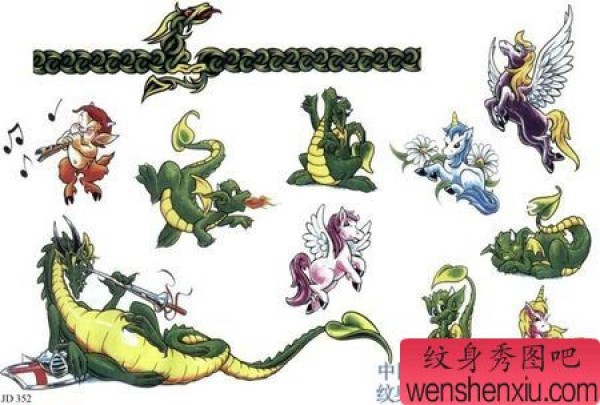 一张可爱时尚小恐龙独角兽纹身图案