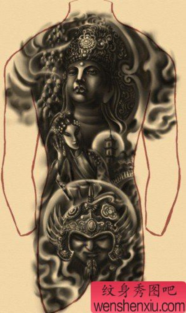 超霸气的满背佛花旦天兵天将纹身图案