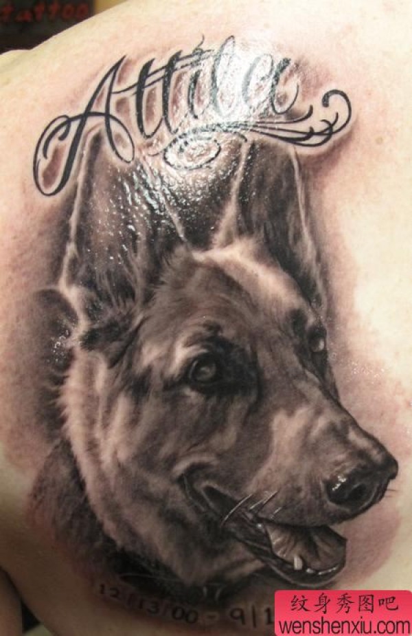 后背可爱的黑灰狗狗纹身图案