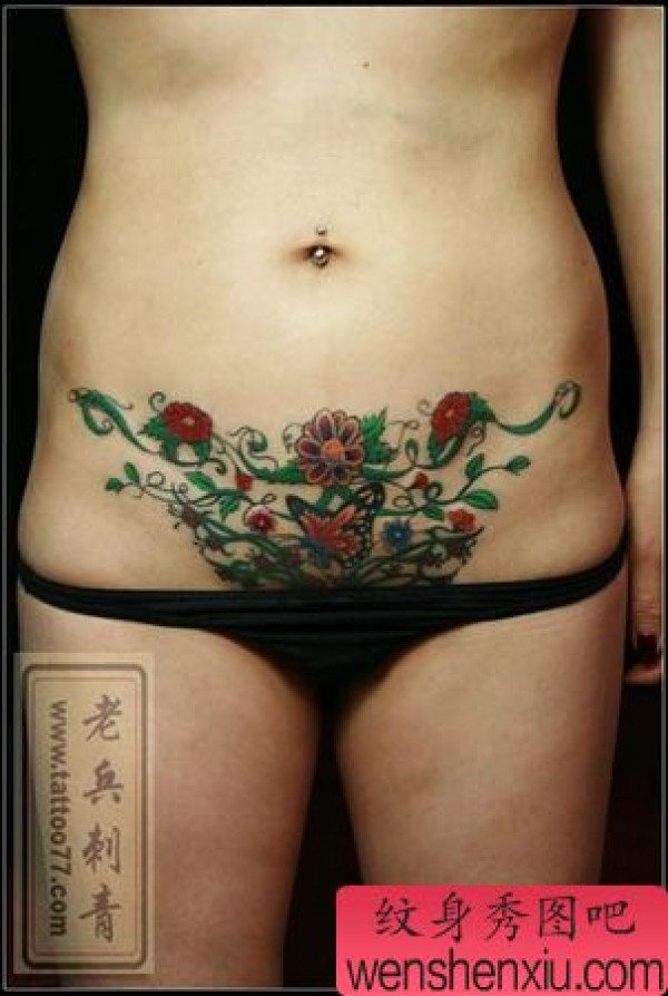 美女腹部彩色蝴蝶花卉藤蔓纹身图案