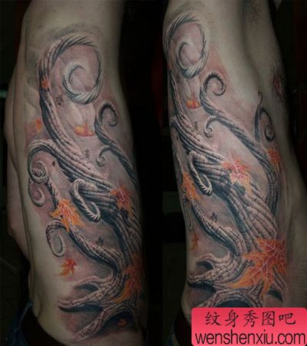 一张侧腰欧美纹身图案3D树枫叶纹身图案