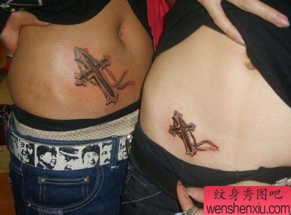 腹部十字架情侣纹身图片