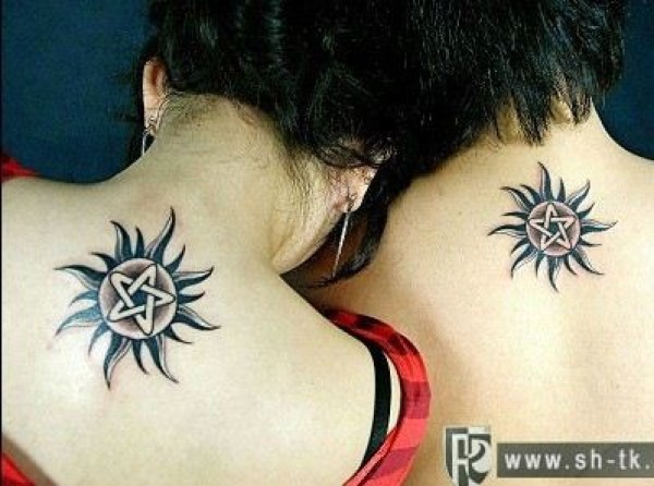 颈部情侣太阳五芒星纹身图案