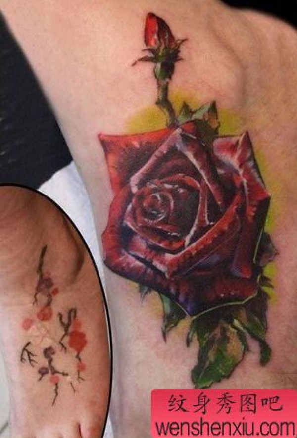 脚部彩色玫瑰花纹身
