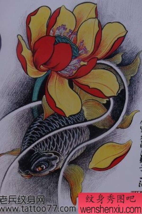 纹身手稿彩色鲤鱼莲花纹身手稿