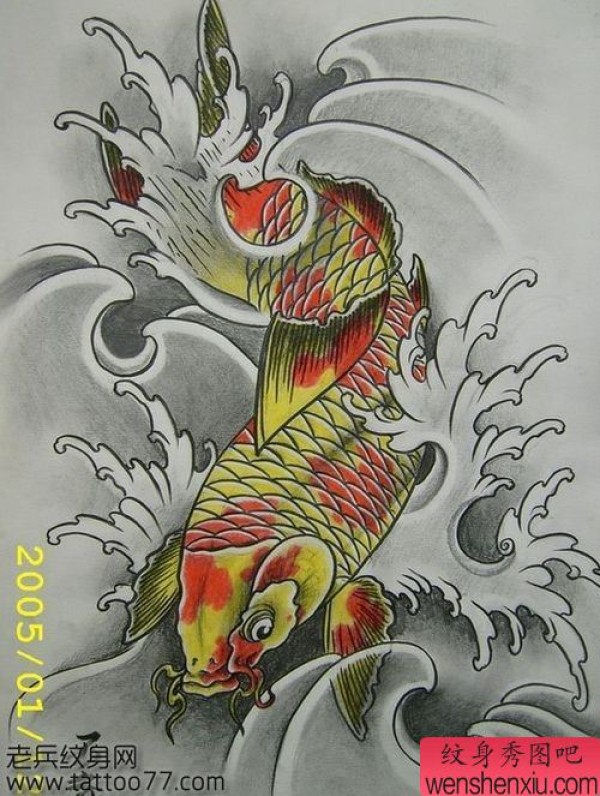 纹身图吧为纹身爱好者分享一张彩色鲤鱼纹身手稿