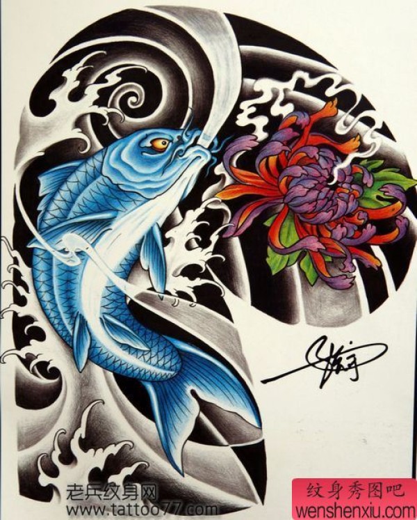 半胛鲤鱼菊花纹身手稿