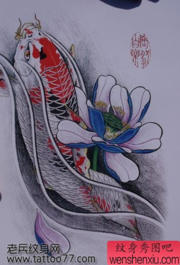 纹身手稿—彩色莲花鲤鱼纹身手稿