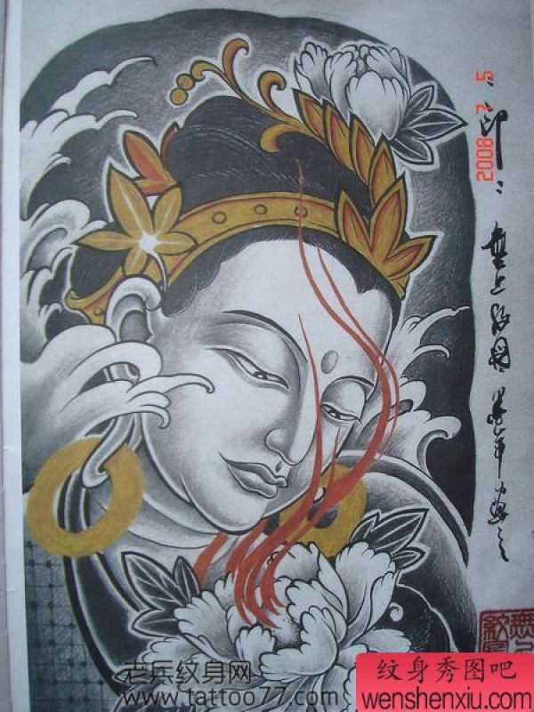 经典的观音牡丹纹身手稿