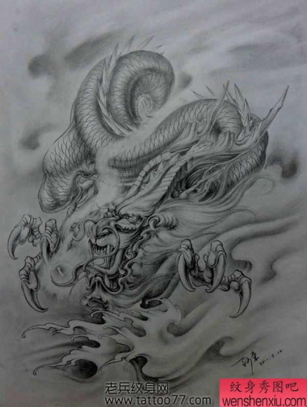 龙纹身手稿_一组老传统黑灰龙手稿纹身图案
