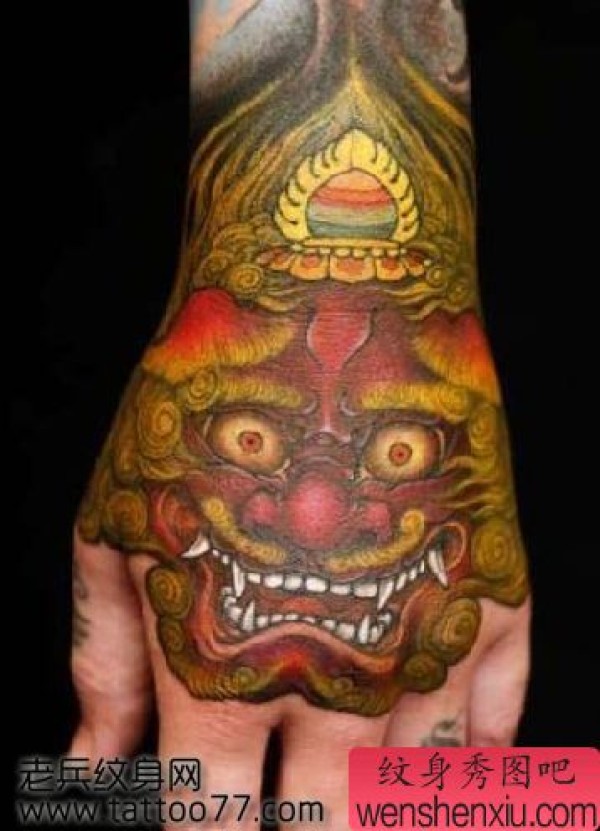 手背彩色唐狮纹身图案