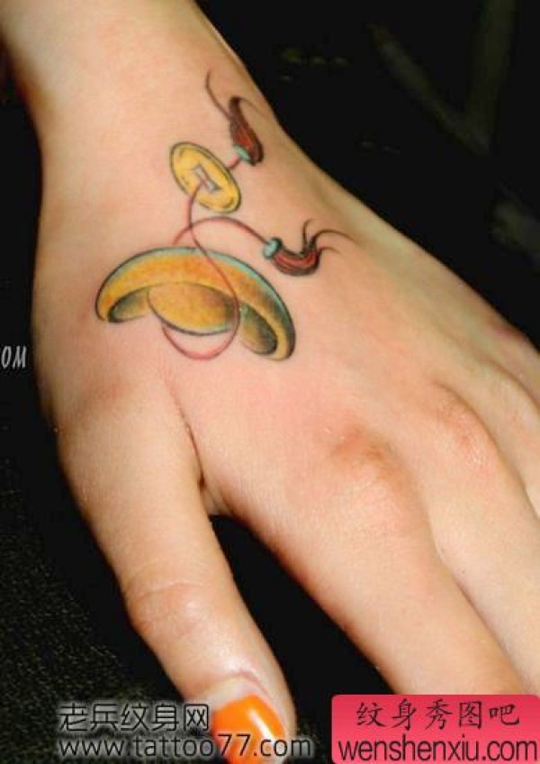 美女手部金元宝纹身图案