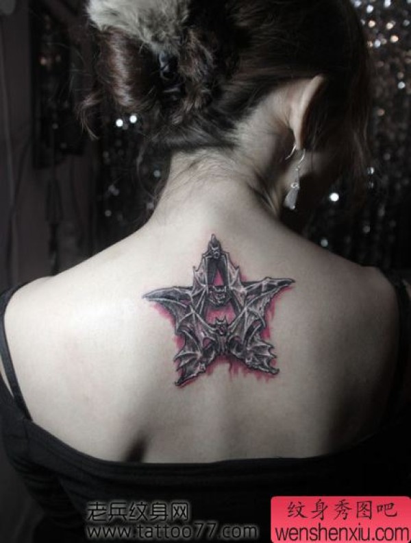 美女背部蝙蝠五芒星纹身图案