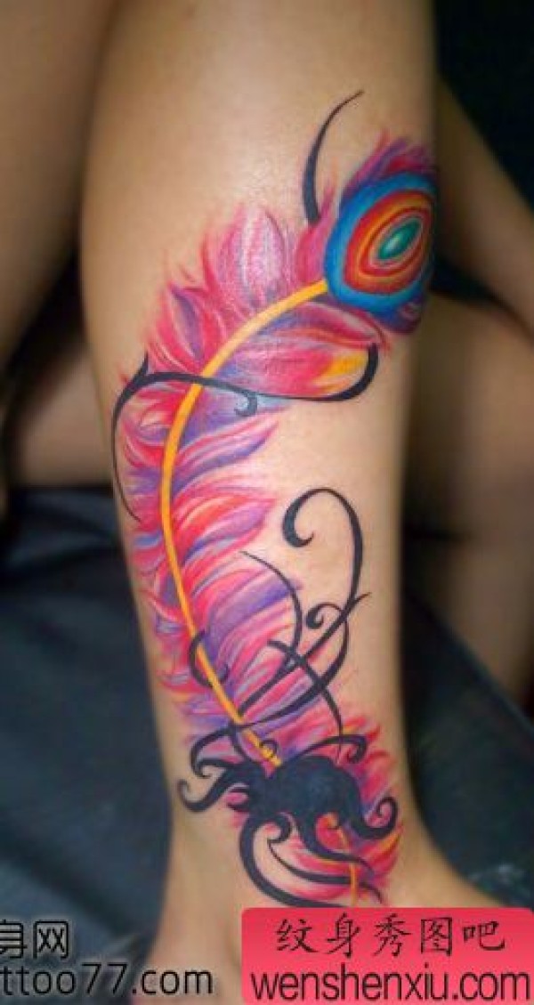 美女腿部彩色羽毛纹身图案