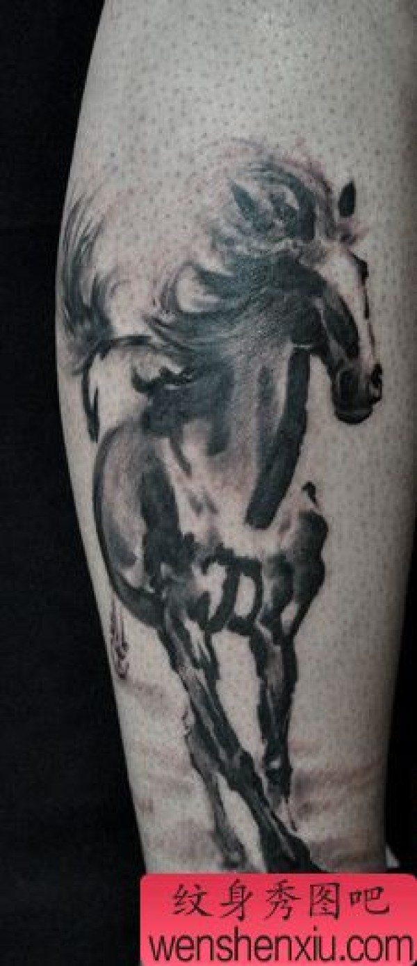经典的腿部水墨画马纹身图案