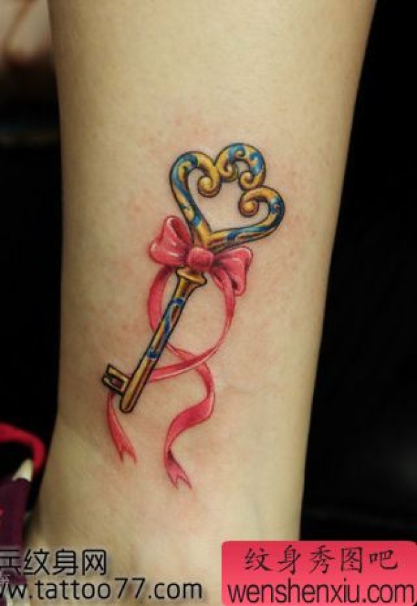 美女腿部很漂亮的钥匙蝴蝶结纹身图案