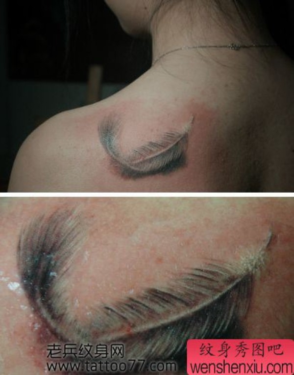 美女肩部唯美好看的羽毛纹身图案