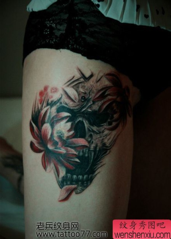 美女腿部经典的骷髅莲花纹身图案