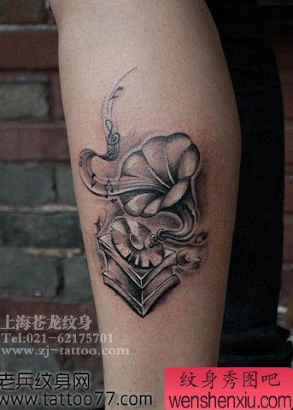 腿部唯美另类的唱片机纹身图案