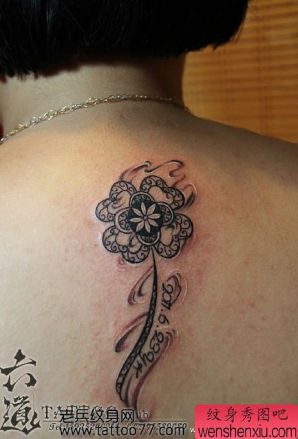 美女背部精美时尚的四叶草纹身图案
