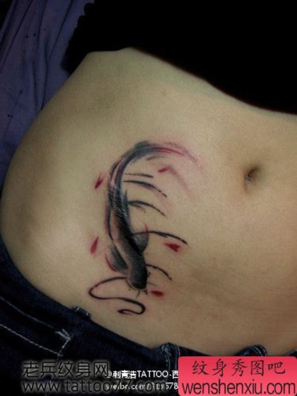 美女腹部水墨画鲤鱼纹身图案