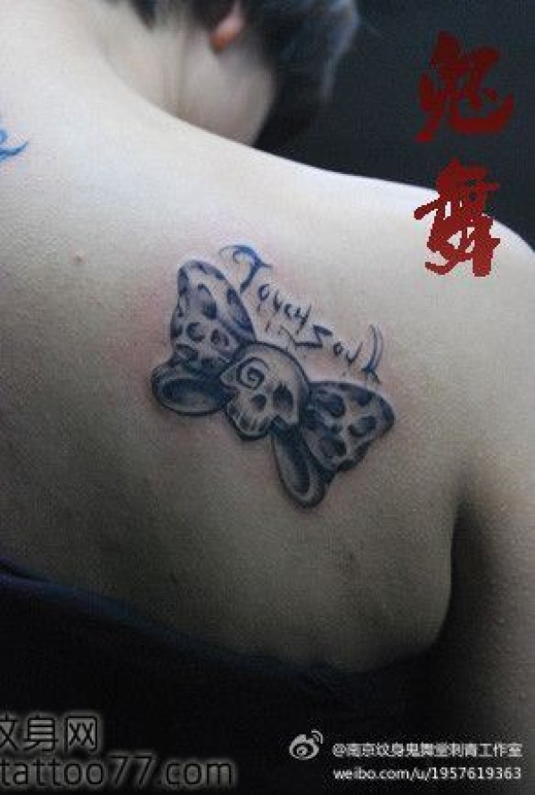 美女肩部时尚经典的骷髅蝴蝶结纹身图案