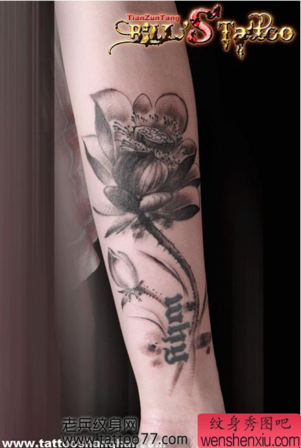 美女手臂黑灰莲花纹身图案