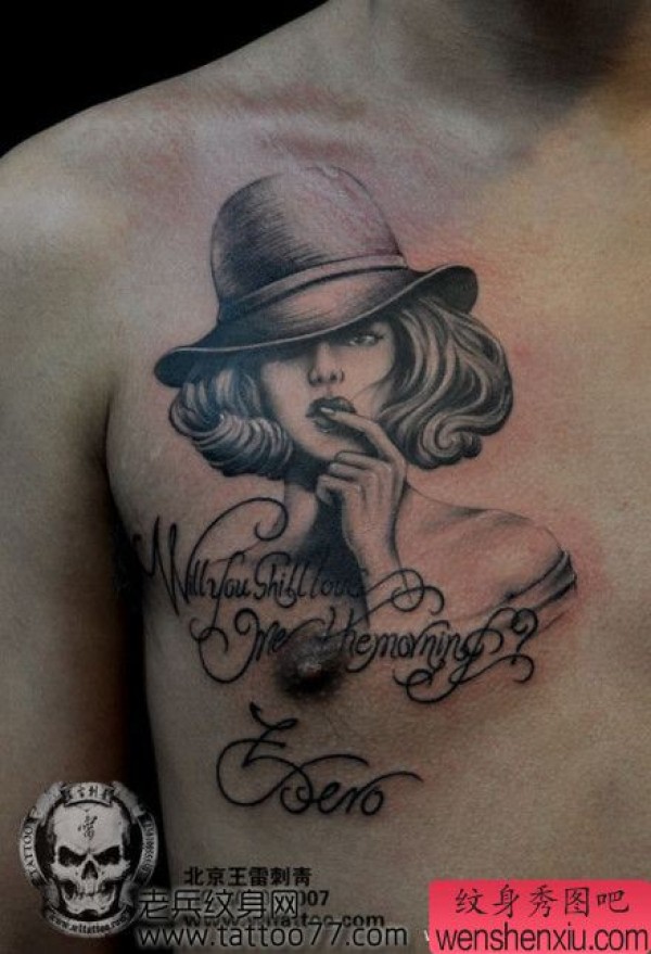 经典的胸部美女肖像纹身图案