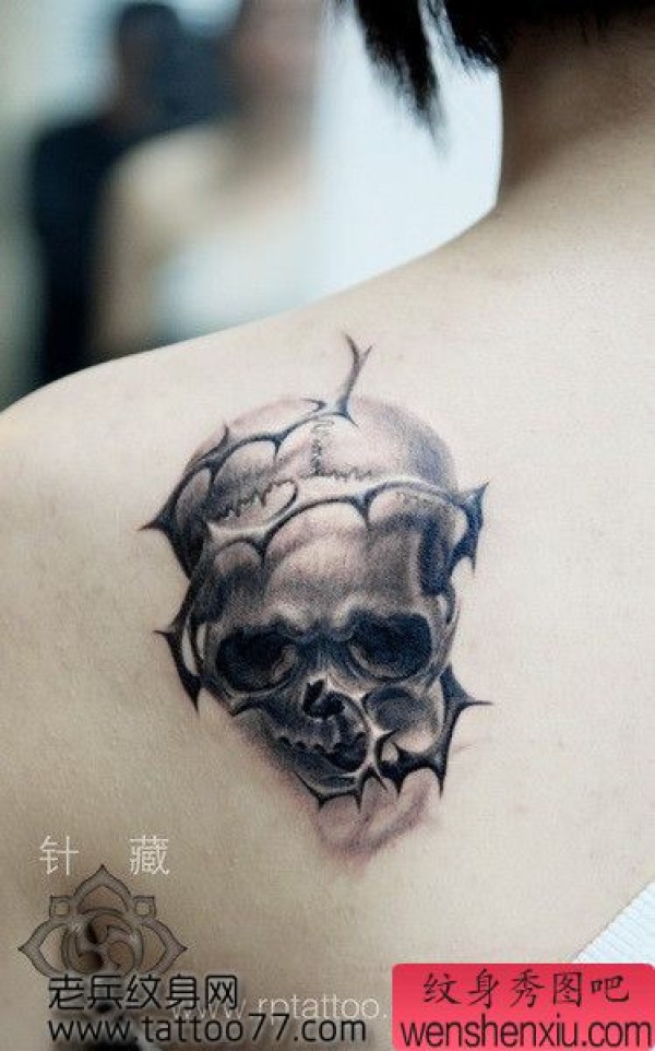 美女肩部经典骷髅荆条纹身图案