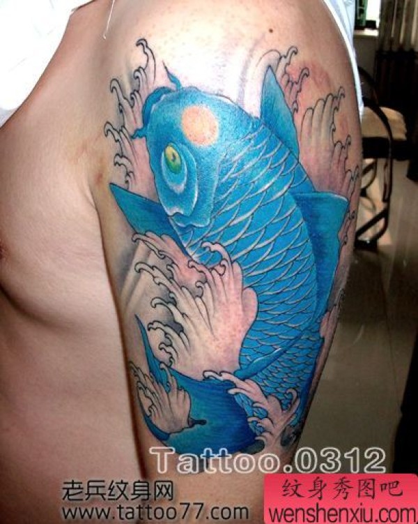 大臂彩色鲤鱼纹身图案