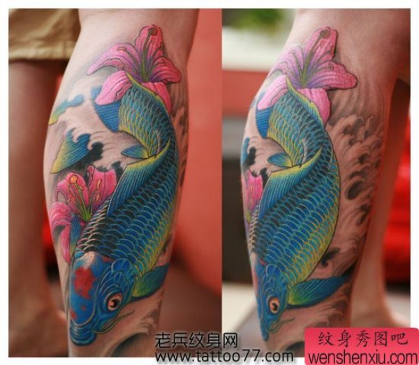 腿部华丽的彩色鲤鱼百合花纹身图案