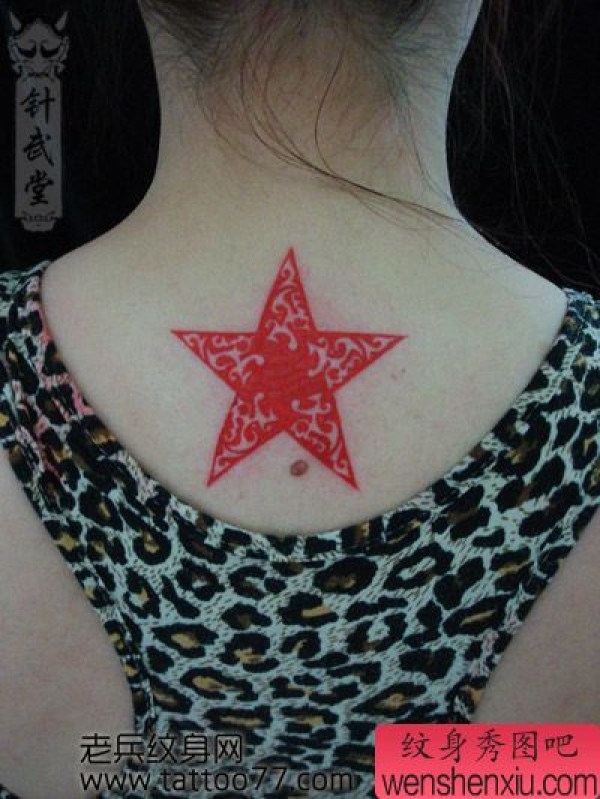 一张女孩子背部彩色图腾五角星纹身图案