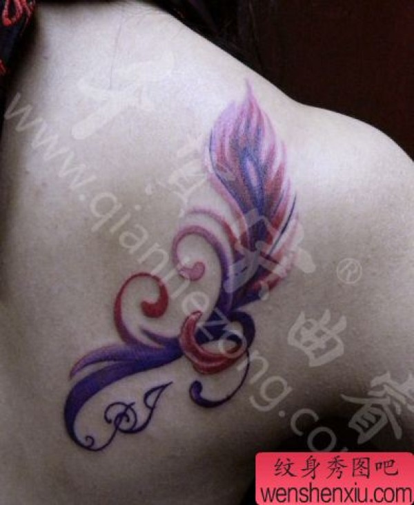 女孩子喜欢的肩部彩色羽毛纹身图案