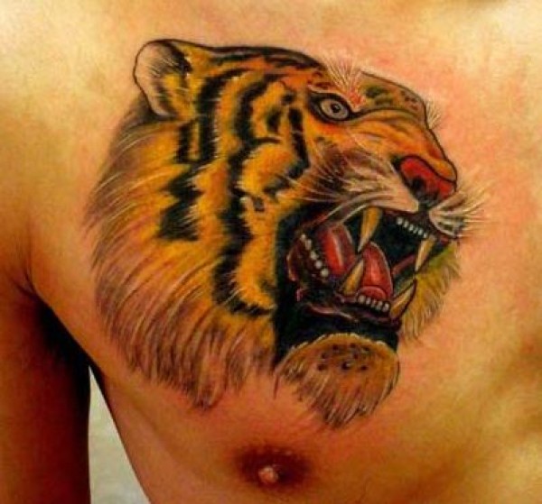 胸部霸气好看的虎头纹身图案