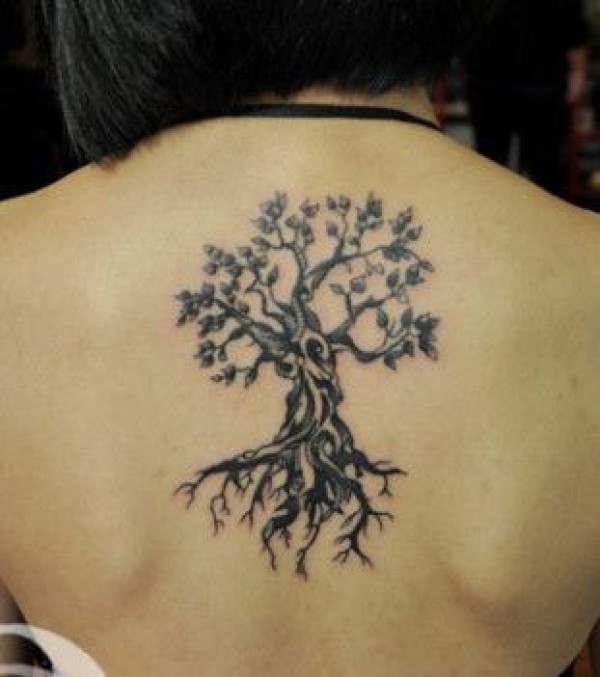 女生背部时尚的图腾树纹身图案
